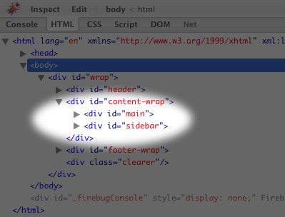 - ดูโครงสร้างเลย์เอาต์ของธีม โดยเปิดไฟล์ index.html ของ colourise ใน FireFox ใช้ FireBug ดูชั้นโครงสร้างเลย์เอาต์ เราก็จะเห็นว่ามันมี 3 ส่วนใหญ่ๆ คือ header , content-wrap และ footer-wrap ทั้ง 3 ส่วนนี้ ถูกห่อไว้ใน wrap ดังรูป